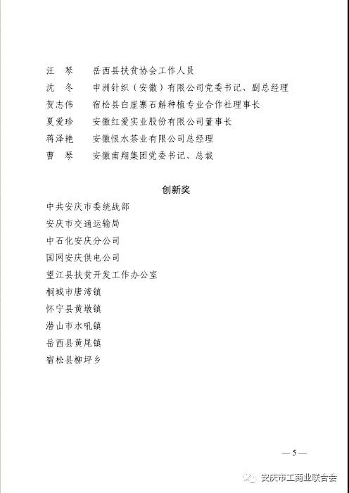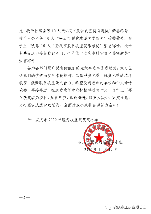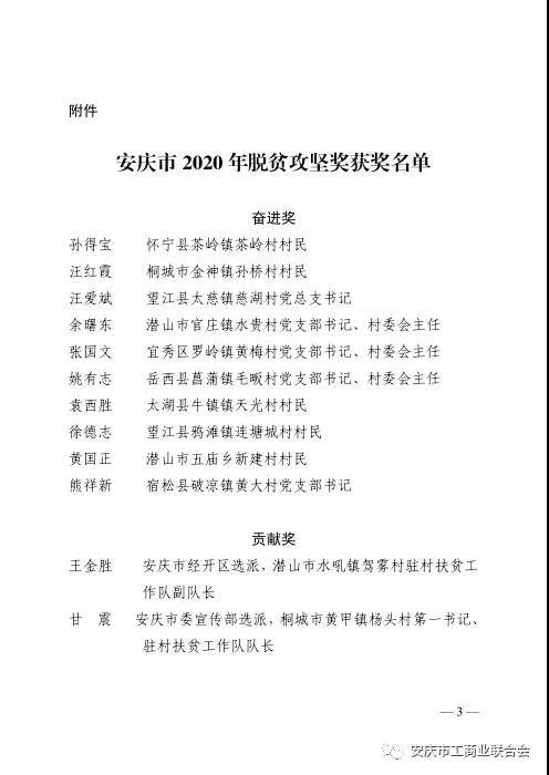 为表彰对全市脱贫攻坚作出突出贡献的先进单位和先进个人,近日,我市公布2020年脱贫攻坚奖获奖名单,其中9位民营企业家荣获“安庆市脱贫攻坚奖奉献奖”称号。他们分别是:
