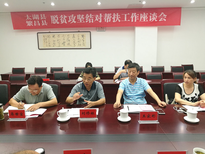 在随后召开的脱贫攻坚结对帮扶工作座谈会上,繁昌县人大副主任刘修林简要介绍了繁昌县县情和经济社会发展情况,以及结对帮扶我县有关工作开展情况。县政协副主席石金印介绍了我县经济社会发展情况及区位优势和投资环境,热忱欢迎繁昌客商到太湖投资发展。两个县相关部门、乡镇及企业负责同志就各自关心的问题,进行了深入交流,为双方结对帮扶工作的深入开展奠定了良好基础。