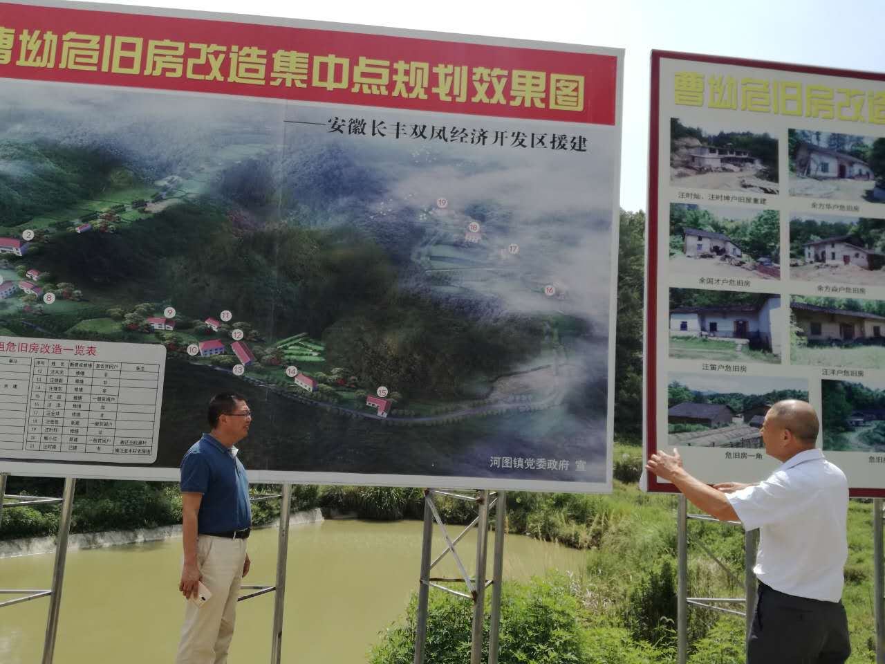 21日,异地安庆商会负责人分两组到五河镇沙岭村、茅山村、百步村和河图镇凉亭村实地察看危房改造情况,慰问贫困户,调研产业扶贫。