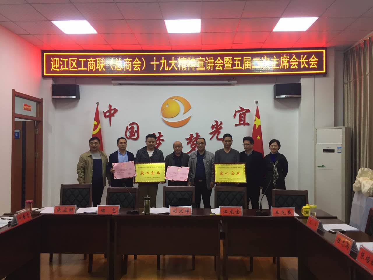 主席会长会上,区工商联主席储艺总结了工商联(总商会)近期工作情况及下步打算;为爱心助学企业代表安庆市万利机有限公司和安庆市置地投资有限公司,企业家代表张清富和杜传忠颁发了荣誉奖牌和证书;区工商联主席会长会首次轮值副会长、安徽宜光集团董事长王克艮介绍宜光集团情况,并于会后带领与会人员参观了宜光集团公司旗下部分企业和安庆市公共关系协会。