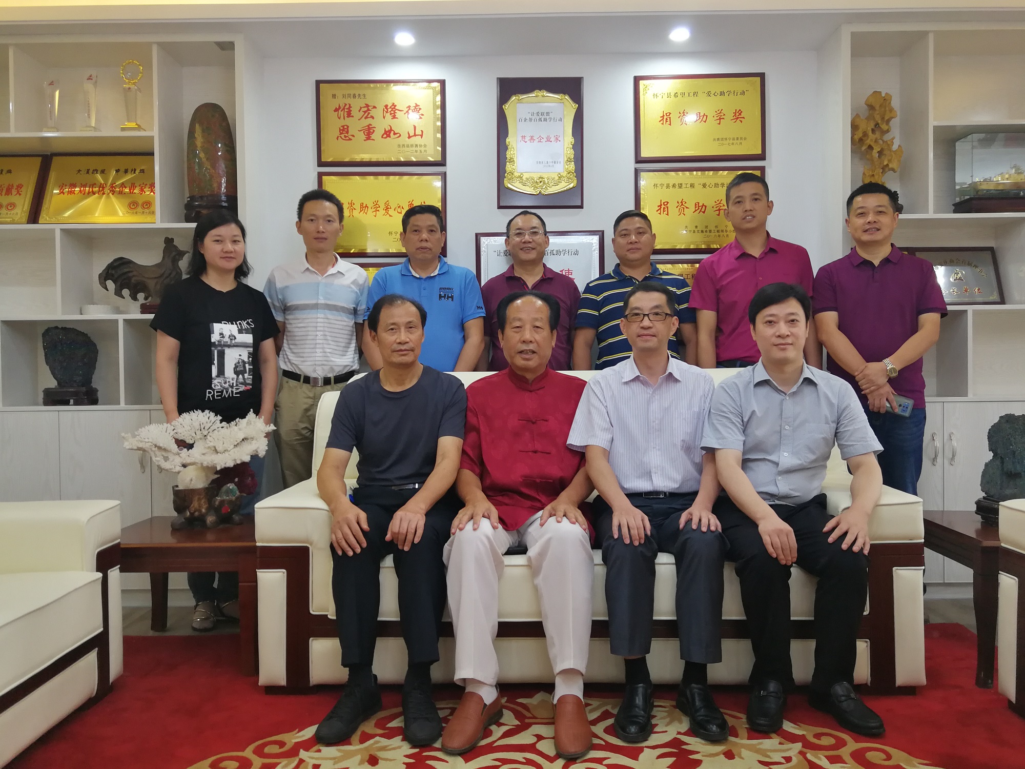 刘同春会长对王晓辉主席一行人的到来表示热烈欢迎,并感谢家乡领导们对合肥市安庆商会的关心和重视。刘会长说:合肥市安庆商会能走过辉煌十年,实属不易,能取得当前卓越成绩,离不开商会全体众力齐聚,理事会成员给予支持,常务副会长们慷慨赞助,会长、秘书长尽职尽责。王主席到来恰是时机,合肥市安庆商会成立即将满十周年,年底也将筹备换届工作。安庆市工商联的调研指导一能为商会换届工作提出重要建议,二来我们也可当面邀请家乡领导们能够出席明年的换届大会暨十周年庆典。刘同春会长还表示,在明年适逢合肥市安庆商会召开换届大会时,邀请全国安庆商会联盟成员聚会之际,建议安庆市政府在肥组织一次项目推介会,让安庆市的优质项目直接与企业家对接,让安庆籍企业家能有为家乡做出贡献的机会。