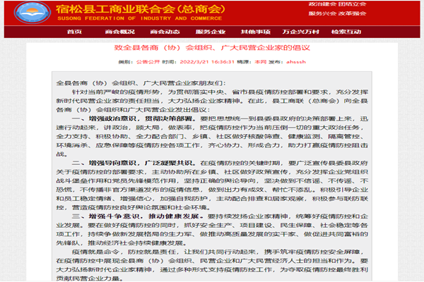 针对当前严峻的疫情形势,宿松县工商联及时安排部署,第一时间向各商(协)会组织、广大民营企业家发出倡议,广大民营企业家积极响应号召,奔赴疫情防控各条战线,承担起不同的工作角色,用实际行动和倾力付出筑牢疫情防控防火墙。